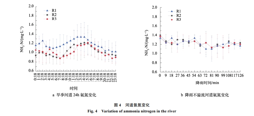 三口井中 S2 在 24h內(nèi)處于穩(wěn)定波動(dòng)狀態(tài),與時(shí)間無明顯關(guān)聯(lián),其余井均有一定關(guān)聯(lián)性。S1在6:50 至 14:50 之間濃度較其余時(shí)間段高,該段時(shí)間為白天生產(chǎn)生活高峰期,用水量較大,可能存在部分污水進(jìn)入雨水管中使其氨氮上升。S3在16:50至 23:50 時(shí),氨氮逐漸從 10 mg 上升為 11 mg,此時(shí)段夜問餐飲廢水增多,易從地面集水口中進(jìn)入雨水管。S1、S3 兩者在凌晨時(shí)段氨氮均有小幅下降,該時(shí)間段為生活用水低谷期,產(chǎn)生污染減少。同時(shí)監(jiān)測小型降雨不發(fā)生溢流時(shí)截流井內(nèi)水質(zhì)監(jiān)測,觀察降雨2h內(nèi)其變化,發(fā)現(xiàn)在降雨前期,氨氮濃度較穩(wěn)定且部分點(diǎn)位出現(xiàn)上升,說明初期雨水存在一定污染,并未稀釋井內(nèi)水體,甚至加重污染在降雨中后段時(shí),S1氨氮逐漸在雨水稀釋下變低;S2由于井內(nèi)濃度并不高,因此受雨水影響較小,呈波動(dòng)狀;S3井內(nèi)濃度先下降后上升,可能是因?yàn)樵谟晁♂屜聺舛认陆担珔R水區(qū)域遠(yuǎn)處來水二次沖刷又帶來污染。