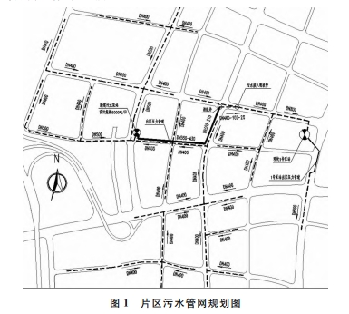 案例項目位于泉州市,為污水管網(wǎng)完善項目。根據(jù)污水管網(wǎng)規(guī)劃,該片區(qū)污水無法通過重力管道排放于現(xiàn)狀1號泵站,需經(jīng)過污水泵站提升后排人市政重力管道,再匯人現(xiàn)狀1號泵站。由于該片區(qū)較低點可用建設(shè)用地緊張,無法建設(shè)傳統(tǒng)污水泵站,方案規(guī)劃時考慮采用占地面積較小的一體化泵站。污水管網(wǎng)規(guī)劃如圖1所示。