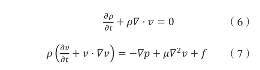 泵站的故障或潛在故障主要分為電氣故障和機械故障。對于電氣故障目前已有相對較可靠的方式,通過互感器感應各類信息,并通過相關智能化模塊判斷和處置故障。水泵機組的機械故障包括結構本身和組合(如泵體、葉片或轉軸裂紋、軸承損壞、緊固件松動和安裝等)引起的故障,還有由于水泵運行工況的變化引起的內部非穩(wěn)態(tài)流動誘發(fā)的工況惡化和穩(wěn)定性問題。理論上完全可通過分析流體和結構相互作用的力學模型加以解決。流體控制方程由連續(xù)性方程和納維-斯托克斯方程(N-S方程)描述,見式(6)~式(7)。