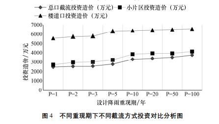 很明顯,樓道口截流,基本就是與分流制類似了,此時從巷道到設計邊界,均需兩套排水系統,同時還需要對建筑合流立管進行改造,故造價自然是最高的,但是對于小片區截流:從樓道至巷道口均為一趟排水系統,只是在截流并的地方需要增加一趟溢流的雨水系統,與總口截流相比,造價略高 10%~15%,但是樓道口截流卻比總口截流基本翻了1倍,結合水質情況,小片區截流水質介于樓道口截流與總口截流之間,不同重現期下不同截流方式投資對比分析如圖4所示: