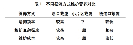 從維護管養對比結果分析可以看出,小片區截流不管是清掏頻率還是維護成本及維護復雜程度都是比較適中的,既避免了總口截流方式旱季流速小易導致淤積的情況,又降低了樓道口截流設置過多小方井增加維護復雜程度,從而降低了維護成本。故綜合來看,小片區截流是比較適合的截流方式。