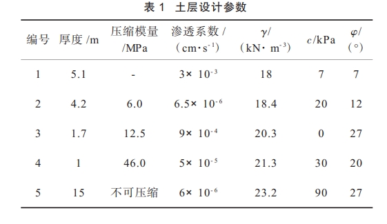 場地的工程地質條件和基坑圍護設計參數見表1(分為五個土層:1 素填土,2粉質黏土,3 粉砂,4 強風化泥質粉砂巖,5 中風化泥質粉砂巖)。