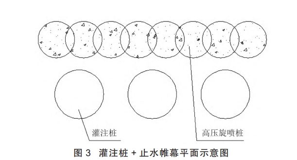 灌注樁支護體系適用于各種地質條件下的深基坑工程,具有剛度大、變形小、技術成熟、施工速度快等優點。當需要隔地下水時,需要另行設置隔水帷幕。考慮到場地內的孔隙潛水,在灌注樁外側設高壓旋噴樁止水帷幕。灌注樁+止水帷幕構造如圖3 所示。