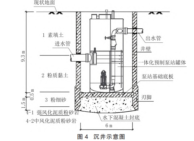 沉井是一種在地面制作后,在井內挖土并依靠自身重量克服井壁與土的摩擦力下沉至設計標高的結構,常用于工業建筑中的構筑物、橋梁基礎、臨時基坑支護等領域4。在市政工程中,鋼筋混凝土主要用于頂管工程中的工作井、接收井等。沉井下沉深度較大,整體性強、穩定性好,可以承受較大的豎向和水平荷載,施工技術簡單,自身具有擋土和擋水的功能,適用范圍廣,且造價不高。但沉井需分節制作,分節下沉,每節高度一般不超過6m。沉井的施工順序一般為地基處理一制作第一節沉井→抽墊木、挖土下沉→沉井接高下沉→封底。沉井混凝土強度達到設計強度的 75%以上時才能下沉,單節沉井施工周期約 20~25 d。本工程地下水豐富,沉井下沉深度范圍內透水層強的粉砂層,可采用不排水法下沉施工,即沉井帶水下沉至設計高程后,采用一定厚度的水下混凝土進行封底。待水下封底混凝土強度等級達到設計要求后再將井內水抽除。水下封底前須有潛水員潛入水下檢查井底是否開挖到位,按設計要求整平基底,并將刃腳混凝土面上的泥土沖洗干凈,以確保水下混凝土有足夠的斷面抵抗地下水的上浮力。沉井如圖 4所示