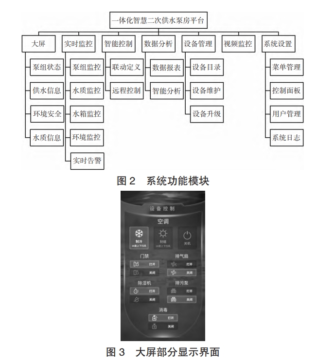 泵房內的主控系統采用物聯網云、邊、端分級架構設計,利用物聯網、云計算、大數據、工業智能等ICT 技術,具有開放、安全、可靠、易用等特點,為泵房提供設備廣泛物聯、數據實時采集、業務自動化、運維智能化等核心能力。該系統部署在泵房的監控中心該系統主要功能包括大屏、實時監控、智能控制、數據分析、設備管理、實時告警和系統設置。系統功能模塊如下頁圖 2所示。