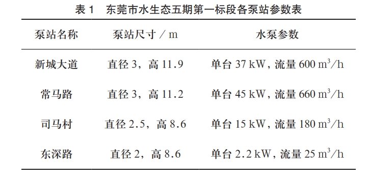 東莞市水生態五期第一標段位于東江南部泛洪區,主要河流包括寒溪河和石馬河,工程所處的河口三角洲河涌密布。屬于南亞熱帶海洋性季風氣候。全鎮降雨充沛,多年平均降水量1970mm。雨量常年集中在4-9月份,占全年降水量的 87.6%。為節約工程投資,減少管網平均埋深,城市污水管網一般設計提升泵站接力排水,在低洼地段污水難以排入污水處理廠,也需要設計提升泵站。近年來隨著環境保護要求的提高泵站的穩定運行顯得尤為重要,而泵站穩定運行的保證需要多種措施并用,設計主要是對各類垃圾的防治,避免堵塞污水管網及水泵,過程安裝工作也要對質量安全細致考慮。東莞市水生態五期第一標段各泵站設備參數見表1。