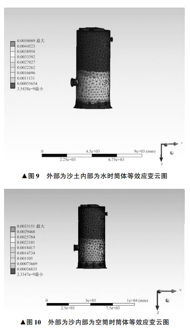 簡體外部為沙,內部為空筒時的等效應變云圖如圖10所示,最大等效應變出現在進口管道和底座附件區域,其值為0.003 3151,與簡體相比變化極小,不會出現斷裂的危險。