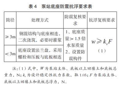 2.1.2 泵站底座結構設計要求泵站底座結構為防止水泵固定處產生震動和共振,需進行防震復核,同時考慮地下水對筒體的影響,進行抗浮復核,處理方式及要求見表 4。