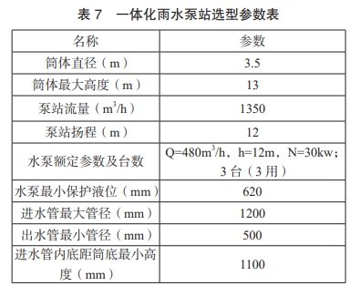 根據需要一體化泵站的流量和揚程可以在圖集選型表中確定主要參數,進行后續集水池有效容積及液位的計算。張孔峰四認為當下一體化泵站的有效容積確定依據不足,胡凱 [0對一體化泵站的有效容積進行了優化設計?;诖?,綜合規范和圖集要求,通過集水池有效容積確定有效水深,進而確定三大液位后,利用 19CS03-2 和 20CS03-1 圖集中“進水管內底距筒底最小高度”這一參數復核三大液位,最終再反推有效容積和有效水深。以某一體化雨水泵站為例,已知流量為1350m'hh,揚程為 12m。主要選型參數如下表7。