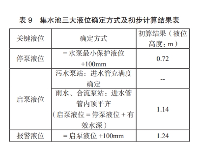 集水池內三大液位由低向高依次是停泵液位、啟泵液位和報警液位。各液位確定方式及初步計算結果見表 9。