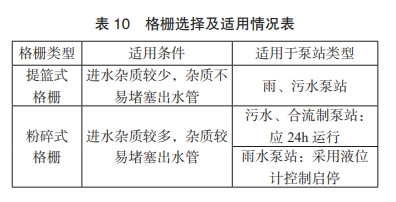 因一體化泵站中所用格柵尺寸相對較小,可依據圖集直接選定型號規格,若需特殊設計時,可按《給排水設計手冊-第5冊城鎮排水》5.1節計算。格柵選擇及適用條件如下表 10。