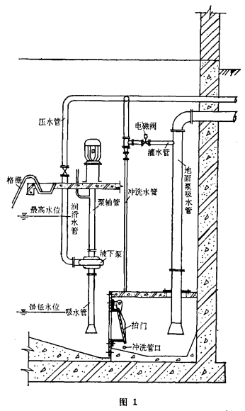 在后一種情況下,當開動立式液下泵時,同時開啟灌水管上的電磁閥。于是該泵的出水分為兩路:一路直接排入泵房的出水井。另一路經地面泵的吸水管、泵體和壓水管排人泵房的出水井,執行灌水排氣程序。當灌水時,底閥內的拍門必有泄漏,然而該泄漏量只會占液下泵出水量的很小一部分。因此灌水仍能在很短時間內完成。當灌水完成后即可啟動地面泵,同時關閉灌水管上的電磁閥。此后,底閥內的拍門就呈開啟狀態,地面泵與液下泵共同運行。