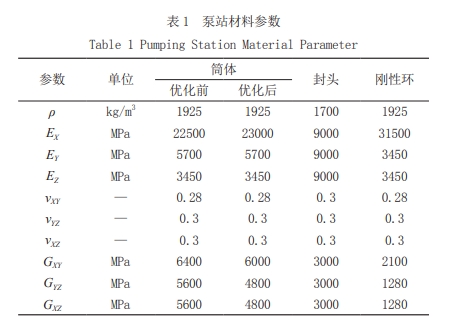 泵站高度h=6.5mm,內徑D=2500mm,簡體厚度 t=15mm(筒體壁厚為某公司經驗值)。出水口為不銹鋼法蘭,進水口為玻璃鋼法蘭。泵站筒體采用定長纏繞工藝制作,封頭采用手糊工藝制作,底座高度 600mm。剛性環采用環向纏繞,截面為矩形,寬度 b=100mm,高度a=40mm,共6道,間距L=1000mm。簡體內襯層厚度 1.8mm,結構層厚度 13.2mm。結構層環向纏繞(簡稱H)共6層(纏繞角86.0°),螺旋纏繞(簡稱S)共 12層(纏繞角 63.0°),鋪層順序為:2H+4S+1H+4S+1H+4S+2H。泵站結構見圖1。各種材料的密度各方向彈性模量、泊松比、剪切模量見表 1。